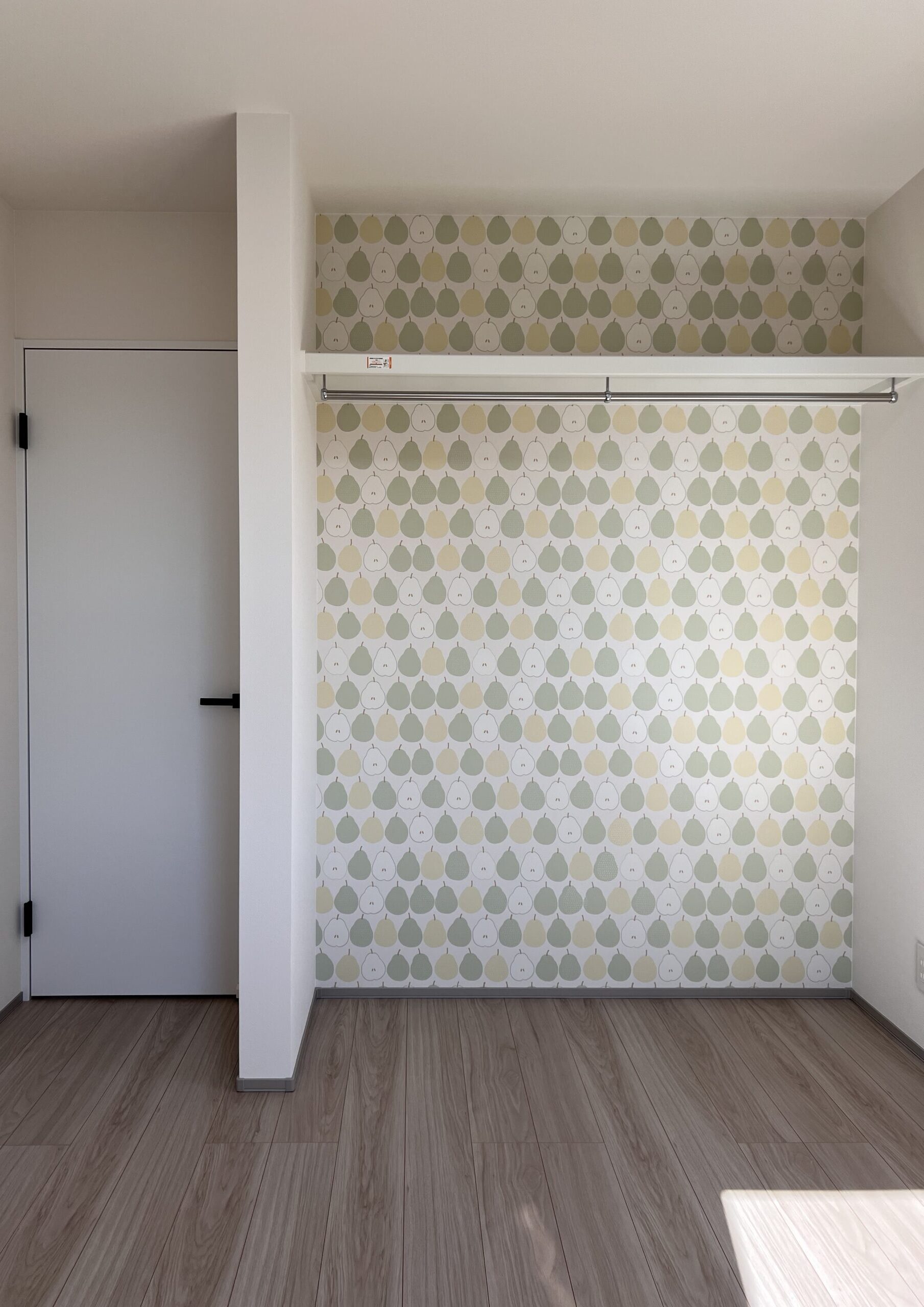 オープンクローゼットのアクセントクロスで明るい印象に。
